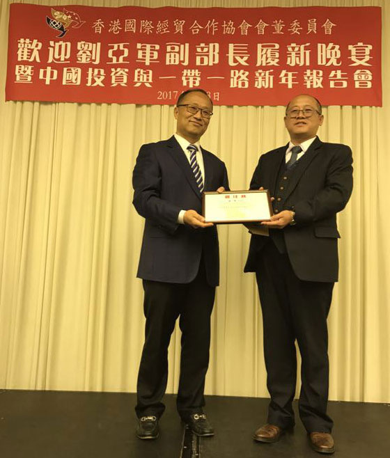 2017年3月8日,匯興智造董事長鐘輝受邀參加由香港國際經貿合作協會會董委員會在港島陽明山莊舉辦的“歡迎劉亞軍副部長履新晚宴暨中國投資與一帶一路新年報告會”。